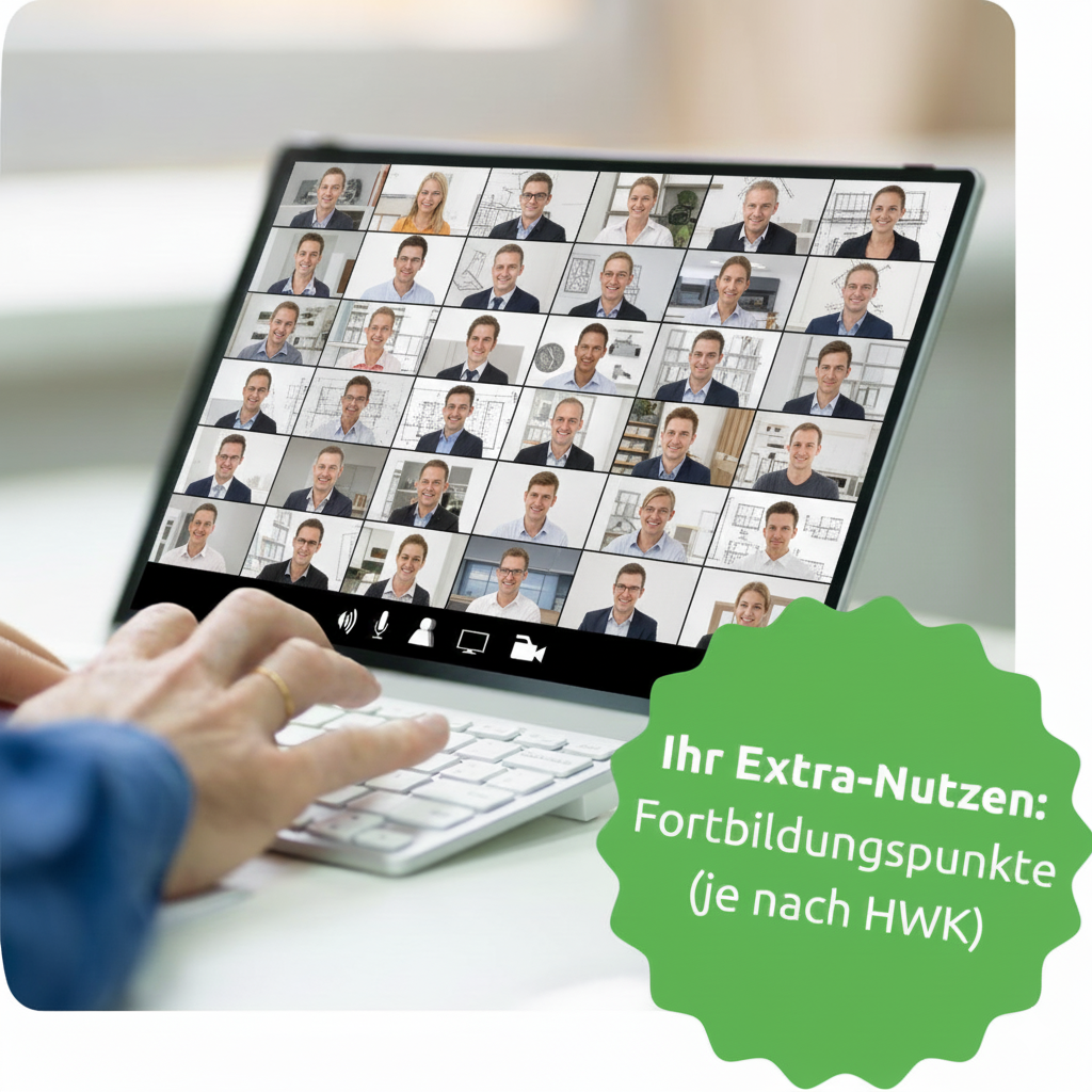 Sie erhalten Teilnahmebescheinigungen für jeden Workshop. Die Anerkennung als Fortbildung liegt im Ermessen Ihrer Handwerkskammer. In NRW können bis zu 8 Punkte pro Jahr anerkannt werden. (Stand: November 2025)